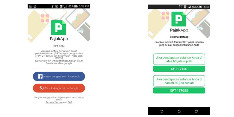 2. Ketika membuka aplikasi PajakApp, pengguna akan disuguhi laman sambutan yang meminta pendaftaran. Pengguna bisa mendaftarkan diri menggunkan akun Facebook atau Google, setelah pengguna akan diminta memilih formulir pajaknya. Ada dua pilihan formulir, yaitu SPT 1770S untuk pendapatan setahun di atas Rp 60 juta dan SPT 1770SS untuk pendapatan setahun di bawah Rp 60 juta.